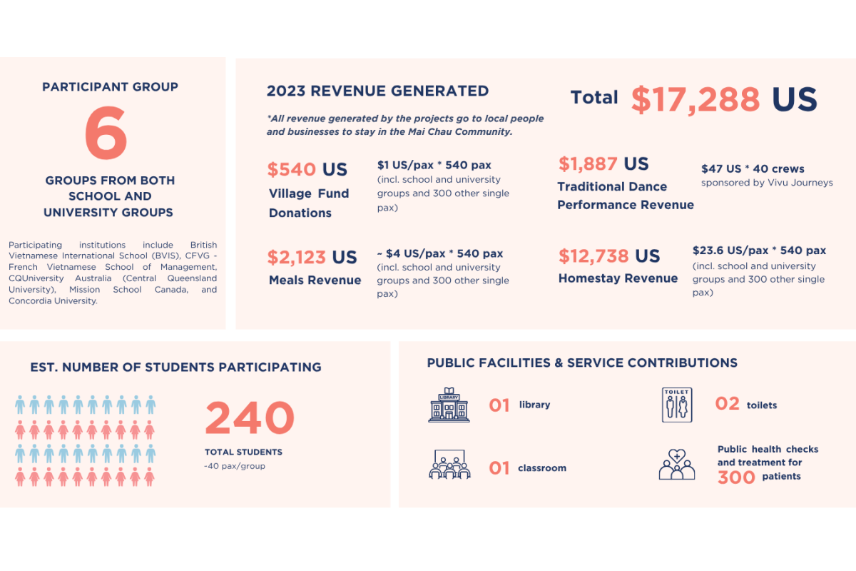 In 2023, our Mai Chau community development projects delivered measurable economic and social impact, generating direct income for residents while supporting essential public services. The Mai Chau community development projects generated approximately USD 17,288 in revenue, directly supporting local communities through various community-based activities.